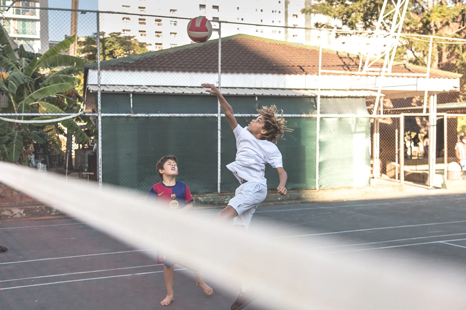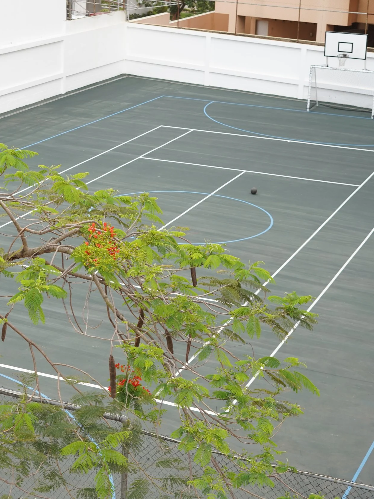 Our full-size ball court offers plenty of space for games and sports like football, tennis and volleyball. Both school and preschool children enjoy swim classes as well as play-time in our generous pool. During evenings and weekends, parents and children alike are welcome to use our facilities for playtime, sports and relaxation.